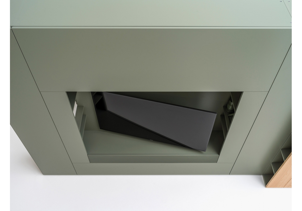 Core conçu par R&D Caccaro pour Caccaro est un système modulaire avec ouverture coulissante et meuble TV, la niche équipée au centre du module se transforme en un espace totalement dédié à la technologie qui abrite la TV et cache les câbles. Disponible en différentes finitions et dimensions.
