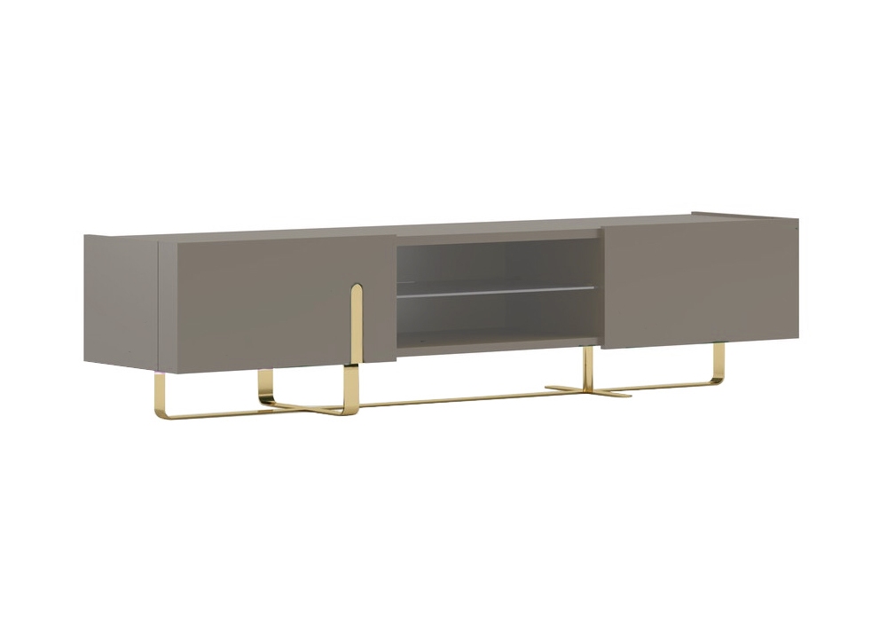 Bradley conçu par Gualter Torres pour Gual Design est un meuble TV avec structure avec un tiroir et une porte abattante en laqué mat et pieds en fer laqué noir ou en acier inoxydable doré. Il y a une étagère en verre dans le compartiment ouvert. Disponible en différentes finitions.