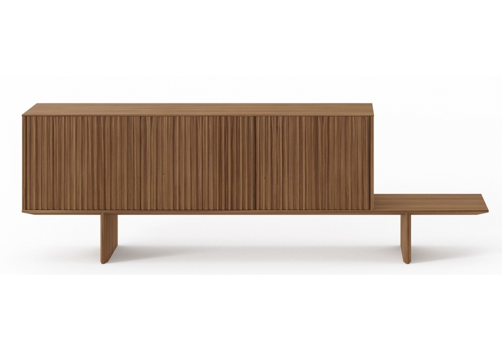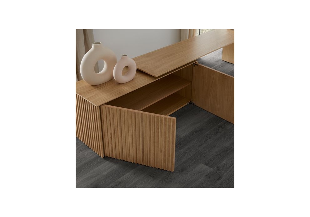 Velasca conçu par Ludovica et Roberto Palomba pour Punt est un meuble tv avec structure en MDF plaqué chêne naturel, portes battantes sans poignées avec ouverture à 105º avec charnières cachées et pieds avec mécanisme réglable intégré. Dans chaque compartiment se trouve une étagère centrale. Disponible en différentes finitions et dimensions.