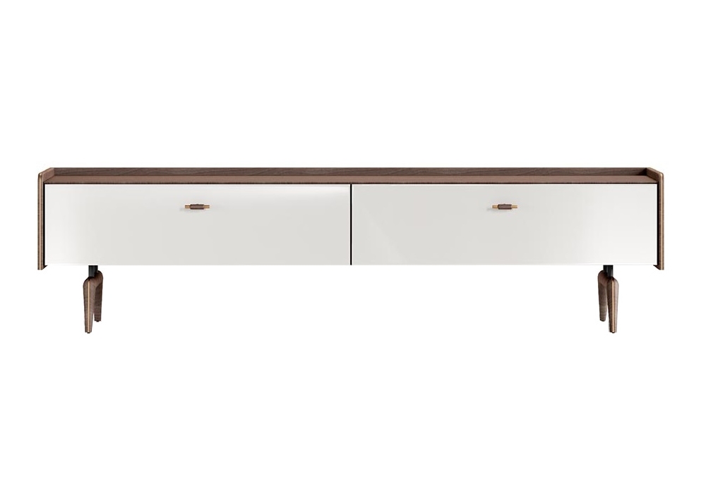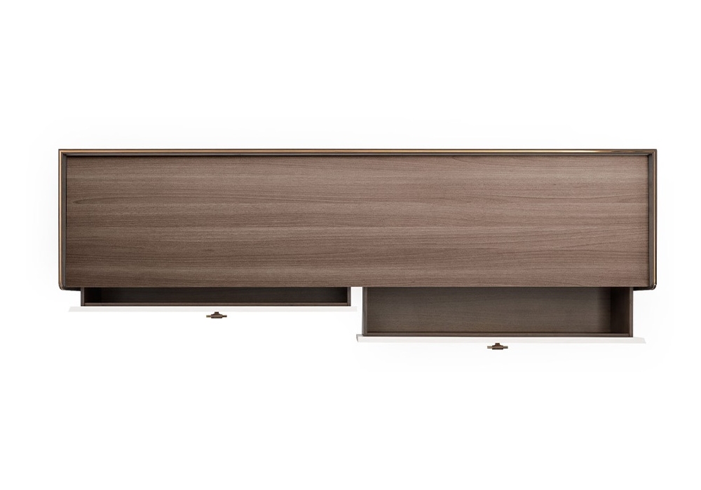 Blues conçu par Giuseppe Viganò pour Turri est un meuble TV avec structure en bois de noyer plaqué et pieds en noyer massif. Les façades peuvent être en bois laqué brillant, en placage de noyer ou recouvertes de cuir. Plateau en marbre, cuir ou noyer plaqué.