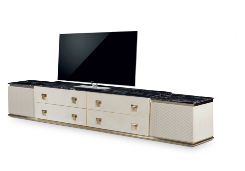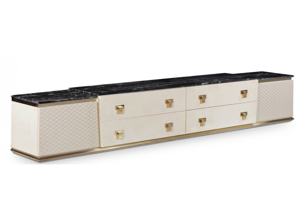 Vogue conçu par Andrea Bonini pour Turri est un meuble TV avec structure en MDF, contreplaqué et panneaux de particules en finition laquée brillante. Plateau en marbre ou bois. Portes recouvertes de cuir brodé d'un motif hexagonal à l'extérieur et lisse à l'intérieur.