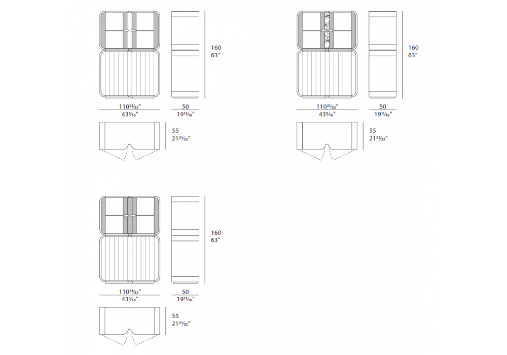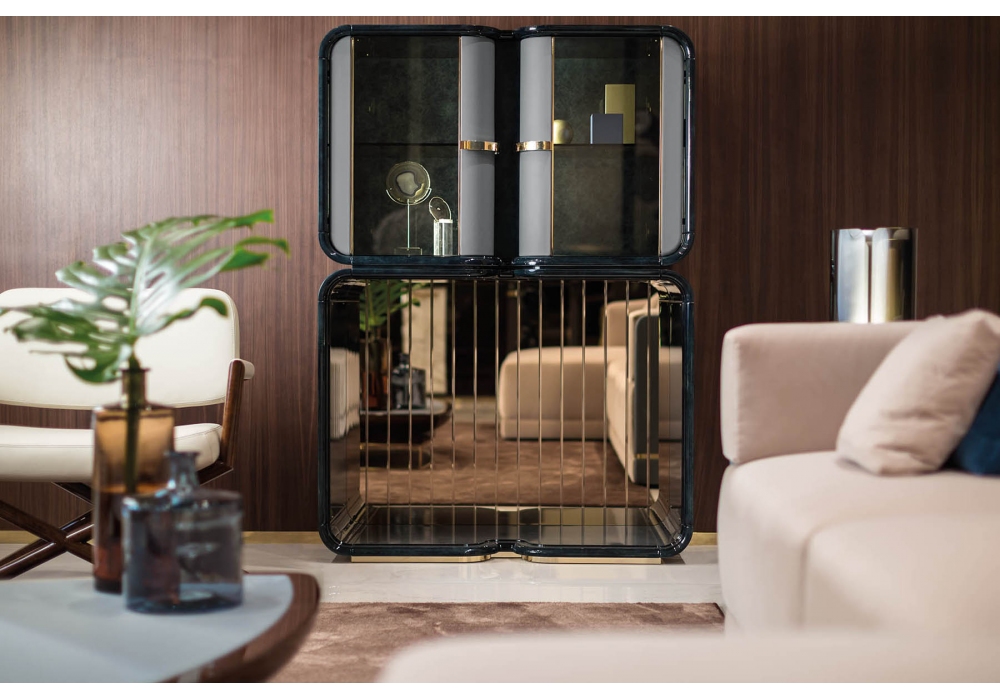 Madison conçu par Andrea Bonini pour Turri est un meuble bar avec structure en MDF et panneaux de particules en finition laquée brillante. Il y a deux portes en verre bronzé avec des inserts en cuir avec un pilier central en marbre, en bois laqué brillant ou en cuir. À l'intérieur, il y a un compartiment avec une étagère en verre bronzé et un compartiment ouvert avec des parois en miroir bronzé.