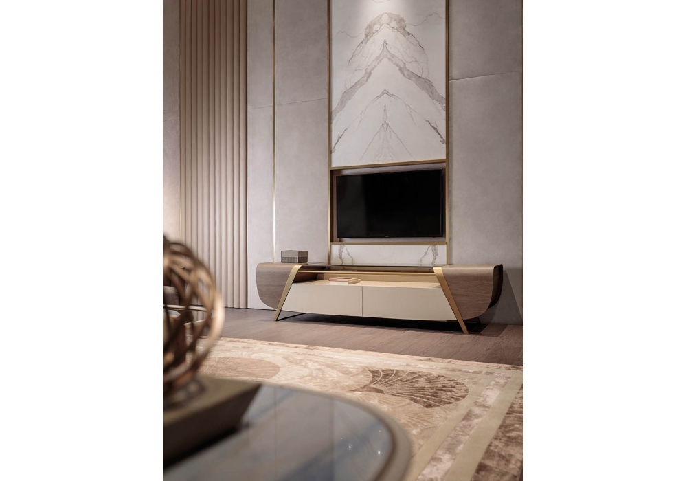 Melting Light conçu par Frank Jiang pour Turri est un meuble TV avec structure en MDF, contreplaqué, panneaux de particules plaqués et bois de noyer massif. Il y a un compartiment ouvert avec un dessus en verre bronzé et une base avec des applications en cuir. Il y a deux tiroirs latéraux à abattant en bois et deux tiroirs centraux coulissants avec revêtement en cuir. Pièces métalliques en différentes finitions.