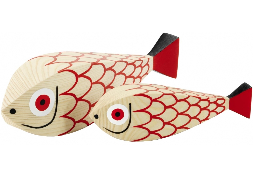Mother Fish & Child conçue par Alexander Girard pour Vitra est partie de la collection Fish & Child Wooden Dolls. Fait de sapin massif, peint à la main, avec un poids en métal dans le corps du poisson.
