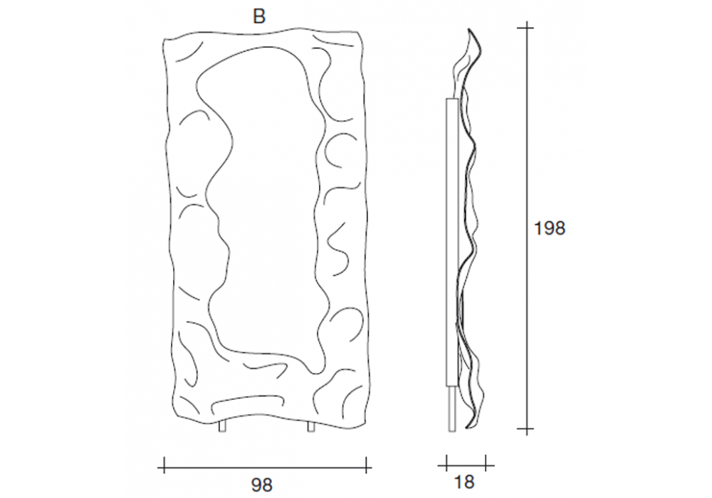 Phantom B conçu par Helidon Xhixha & Dante O. Benini - Luca Gonzo pour Fiam est un miroir rectangulaire en verre fusionné à haute température de 6 mm, argenté au dos. Miroir plat de 5 mm. Châssis arrière en métal peint. Peut être suspendu dans différentes positions.