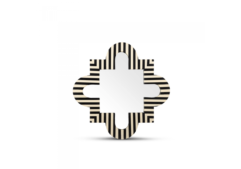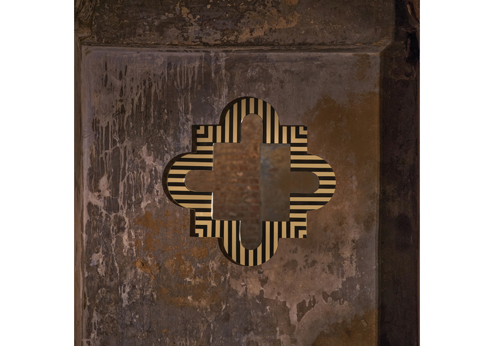 Wings conçu par Matteo Cibic pour Scarlet Splendor est un miroir en MDF avec motif rayé incrusté de résine brillante.