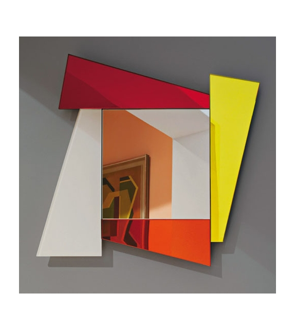Dioniso 1 conçu par Ettore Sottass pour Glas Italia fait partie d'une collection de six miroirs muraux de formes et de tailles variées. Il se caractérise par des cadres polychromes composés d'éléments en miroir feuilleté coloré, en verre feuilleté coloré et en verre laqué.
