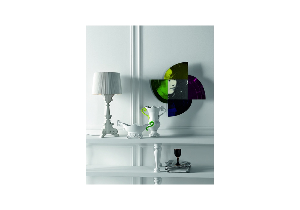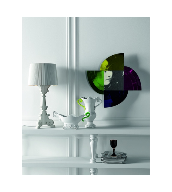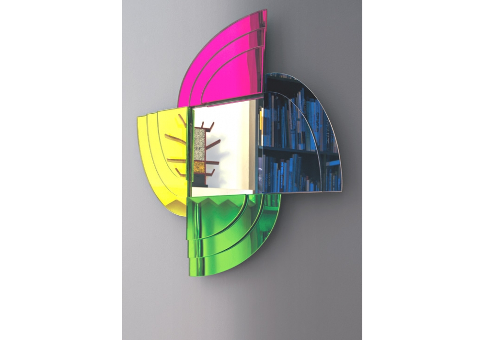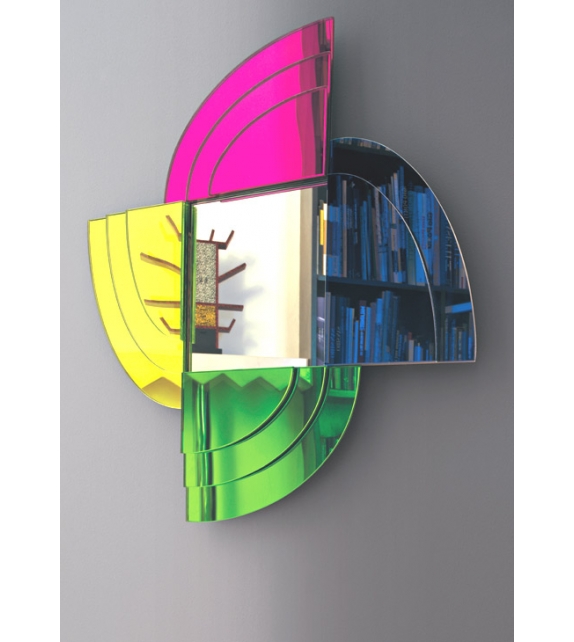 Dioniso 5, conçu par Ettore Sottass pour Glas Italia fait partie d'une collection de six miroirs muraux de formes et de tailles variées. Il se caractérise par des cadres polychromes composés d'éléments en miroir feuilleté coloré, en verre feuilleté coloré et en verre laqué
