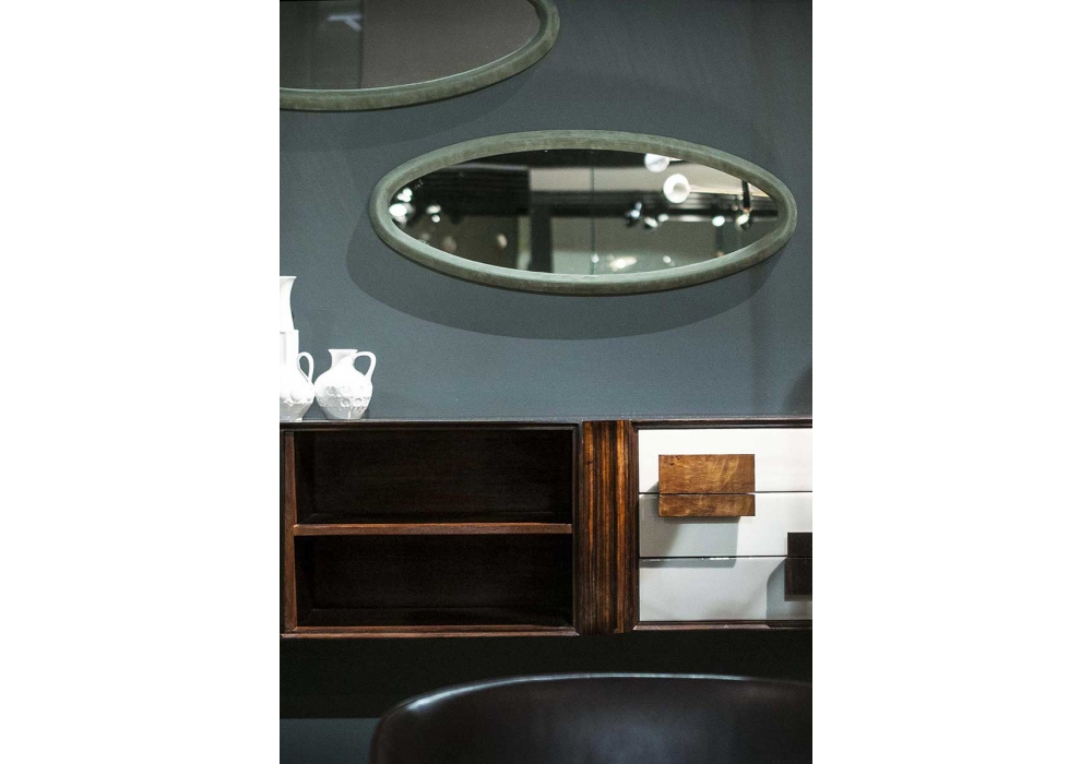 Kodama conçu par Baxter P pour Baxter est un mirior avec structure en contreplaqué de peuplier avec cadre en MDF recouvert de cuir. Miroir arrière. Disponible aussi en la version table avec support en laiton satiné.