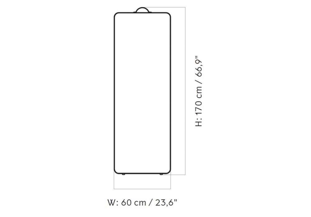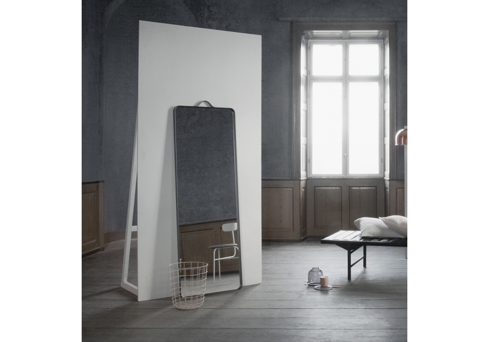 Norm Floor conçu par Norm Architects pour Audo Copenhagen est un miroir de sol en aluminium thermolaqué et doté d'un crochet en cuir.