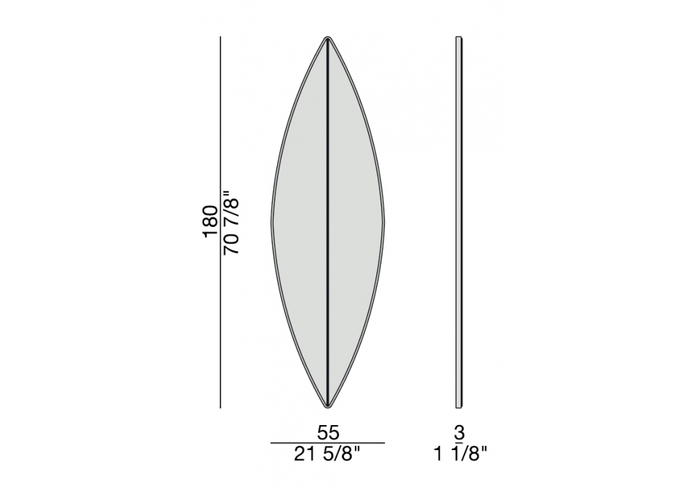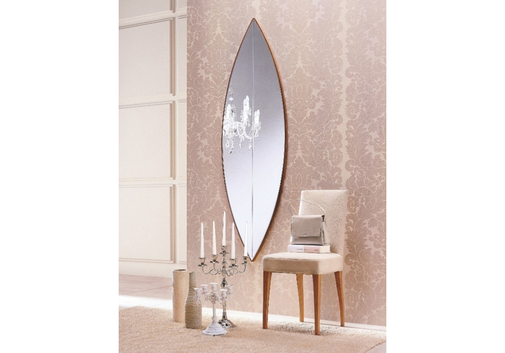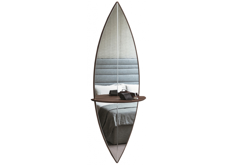 Surf conçu par M. Perego pour Porada est un miroir au mur en noyer canaletta ou pore fermé laqué mat avec biseautage centrale. Disponible également avec l'étagère en la même finition du cadre.