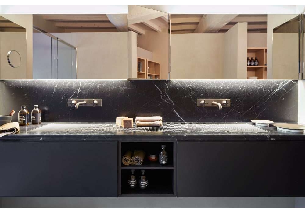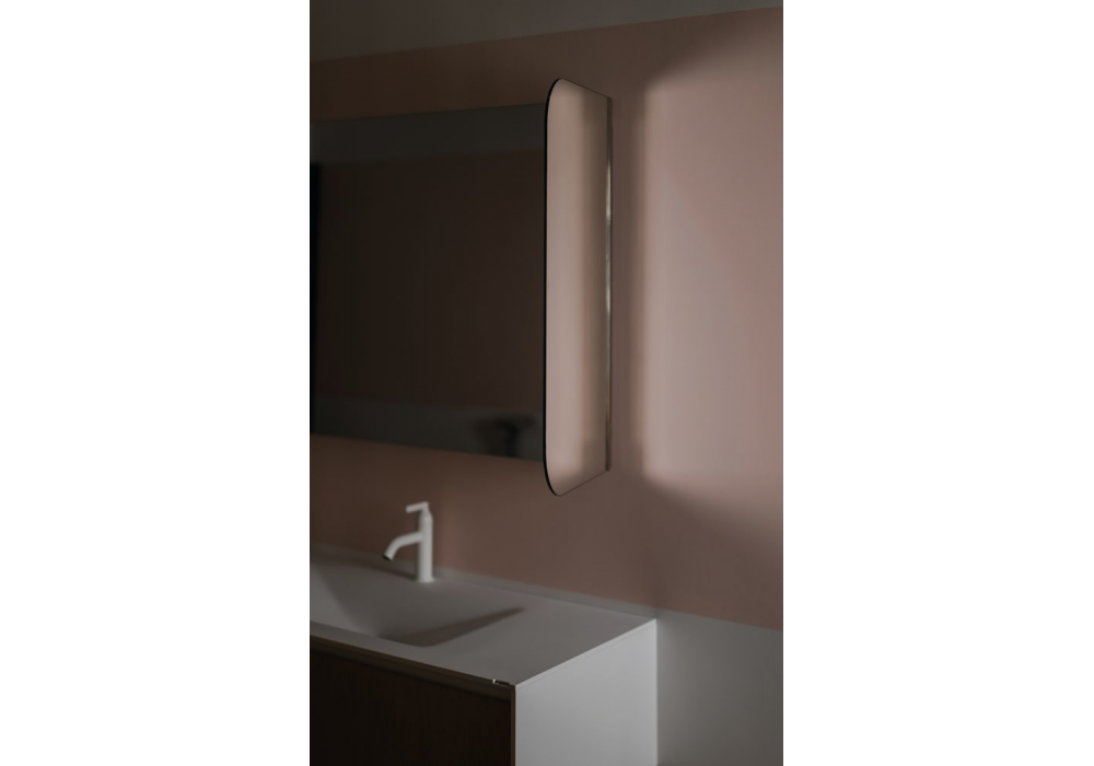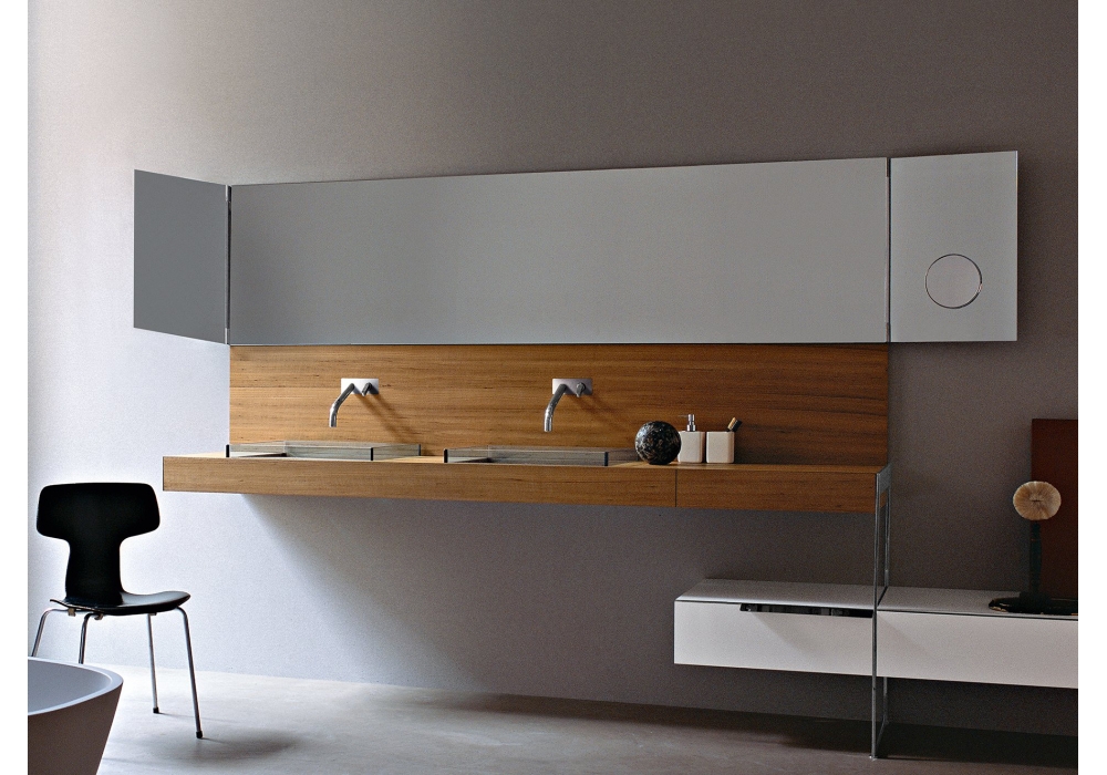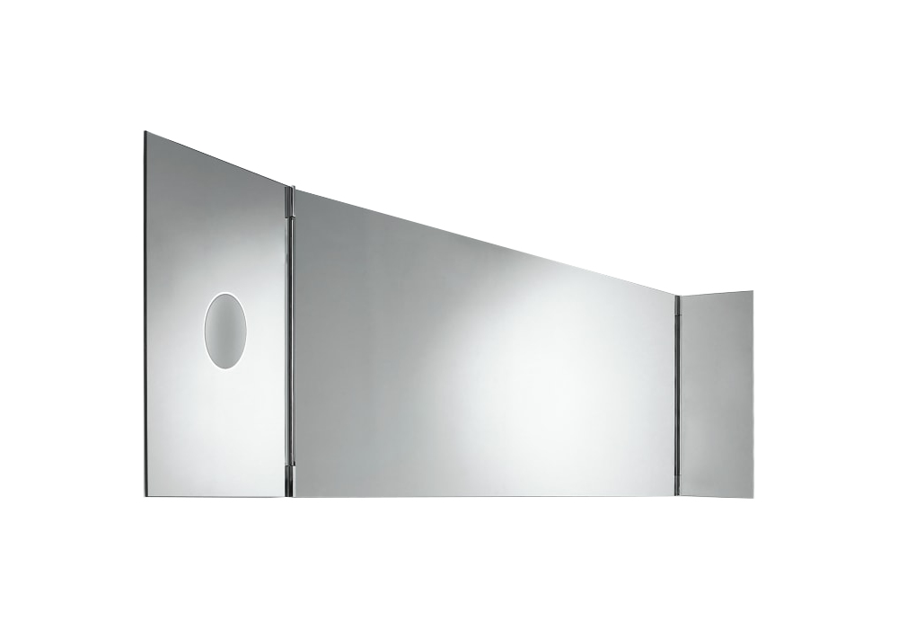 Narciso conçu par Benedini Associati pour Agape est un miroir modulable rectangulaire avec charnières visibles en acier inox poli. Divisé en trois éléments à chants polis et film de protection anti-éclats. Elément central aussi disponible avec mesures spéciales et les éléments latéraux double-face orientables disponible en deux largeurs, 20 ou 40 cm. L’élément central est disponible également avec éclairage LED situé derrière le miroir.