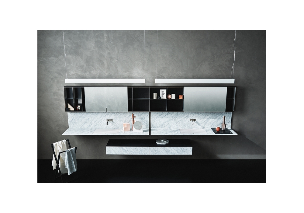 027, conçue par Benedini Associati pour Agape, est une armoire à miroir murale réalisée en contreplaqué de bouleau avec finition en chêne ou en bois reconstitué avec finition en teck. Les éléments de séparation et la poignée sont en acier inoxydable poli ou satiné. La porte en miroir de 3 mm d'épaisseur est protégée par un film de sécurité.