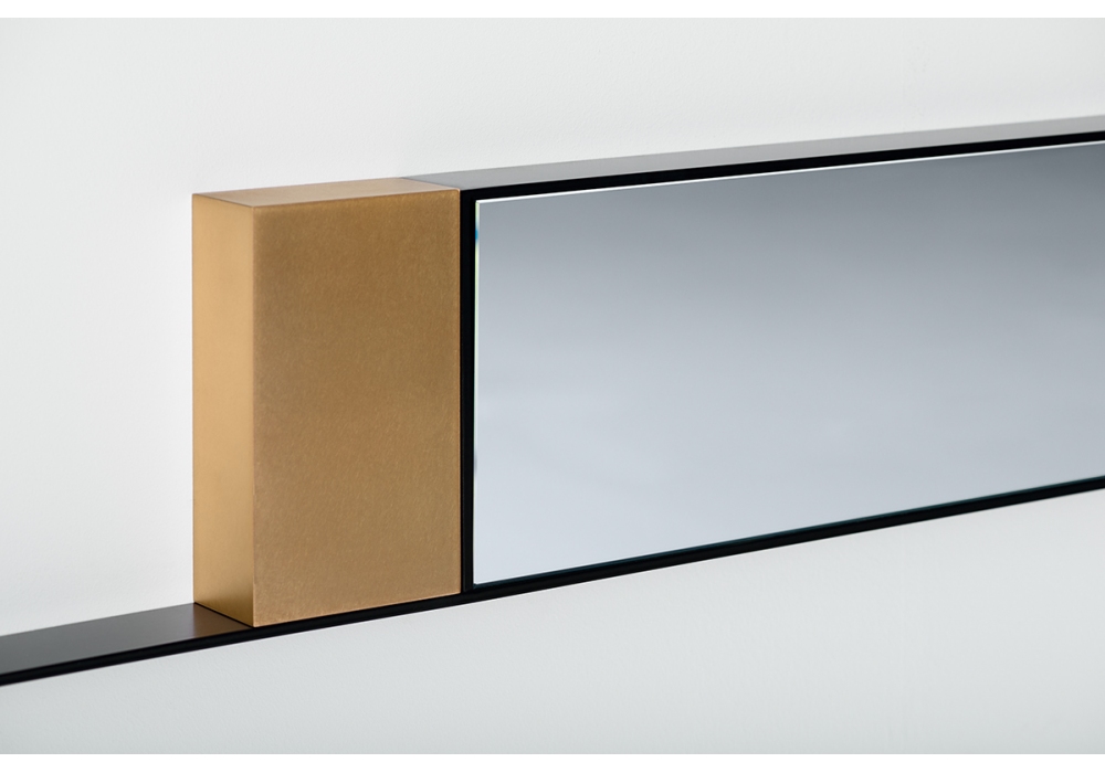 Mirror Lines conçu par Irene Goldberg & Pitsou Kedem pour MDF Italia est un miroir avec une structure en acier en deux finitions avec des éléments décoratifs en laiton, marbre et pierres, disponible en différentes compositions.