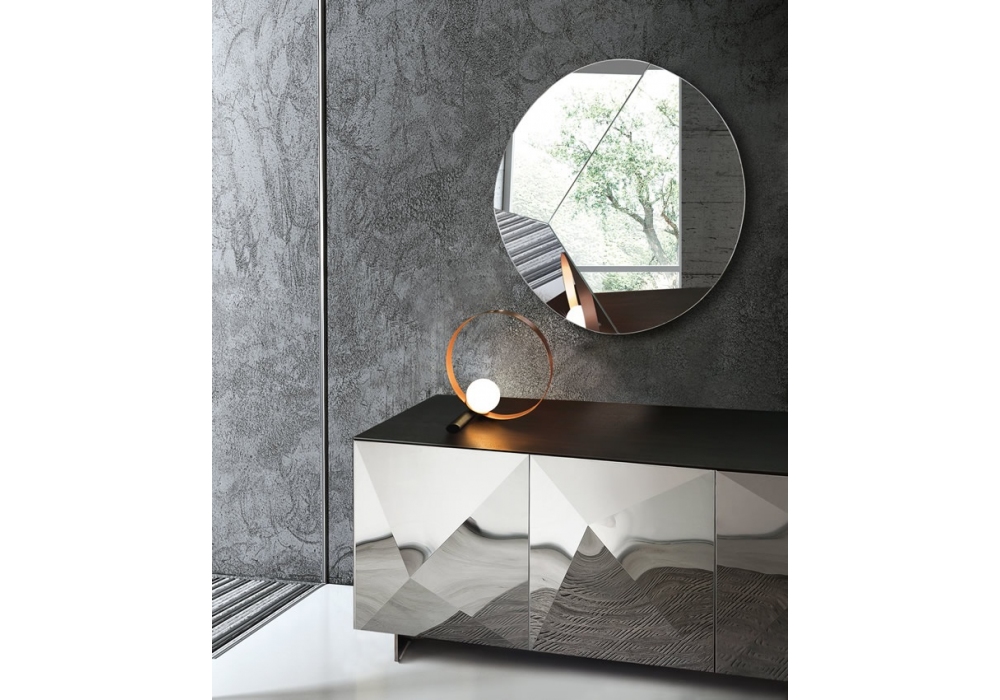 Circle conçu par Riflessi est un miroir tridimensionnel avec des surfaces inclinées appliquées sur un moule en polyuréthane rigide. Installable à 360°.