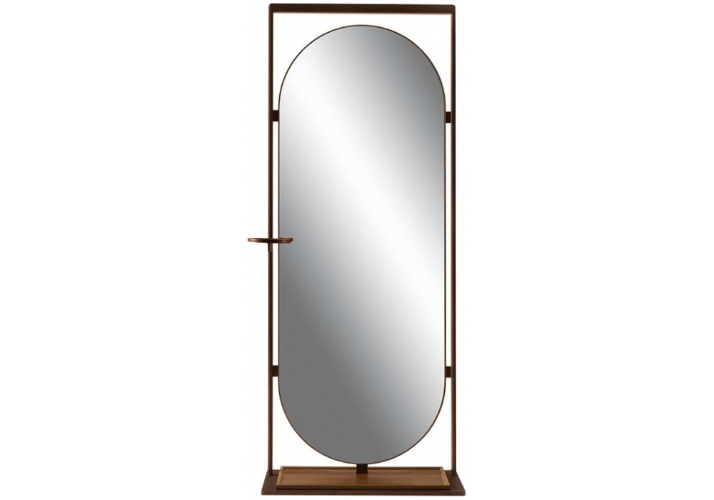 Narcisse conçu par DESIGN MVW pour Giorgetti est un miroir vertical avec structure et base en métal peint bronze. Le cadre, le plateau miroir et celui de la base sont en panneaux de bois, placage et noyer canaletto massif.