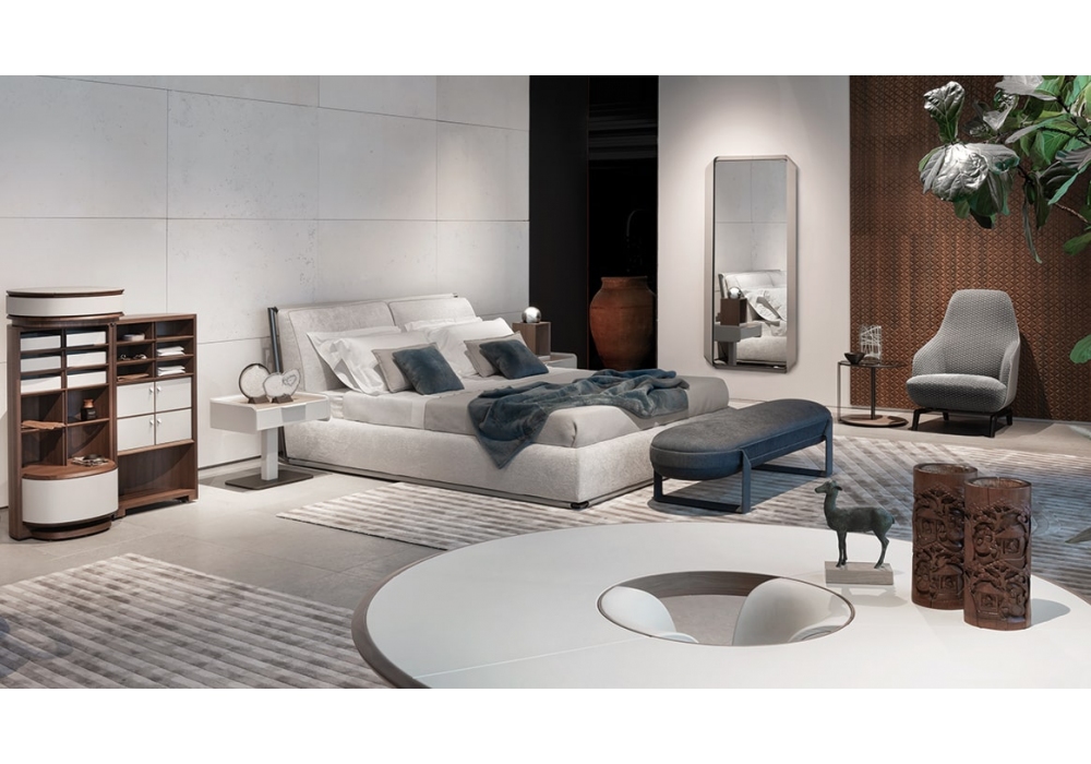Shirley conçu par Carlo Colombo pour Giorgetti est un miroir mural, avec verre extra-clair, avec structure peinte en finition titane effet métal liquide et cône en métal recouvert de cuir. Le miroir peut être monté au mur à la fois verticalement et horizontalement et est disponible avec ou sans éclairage LED intégré. Dans la version électrifiée, l'interrupteur tactile marche-arrêt est positionné sur le côté droit de la structure.