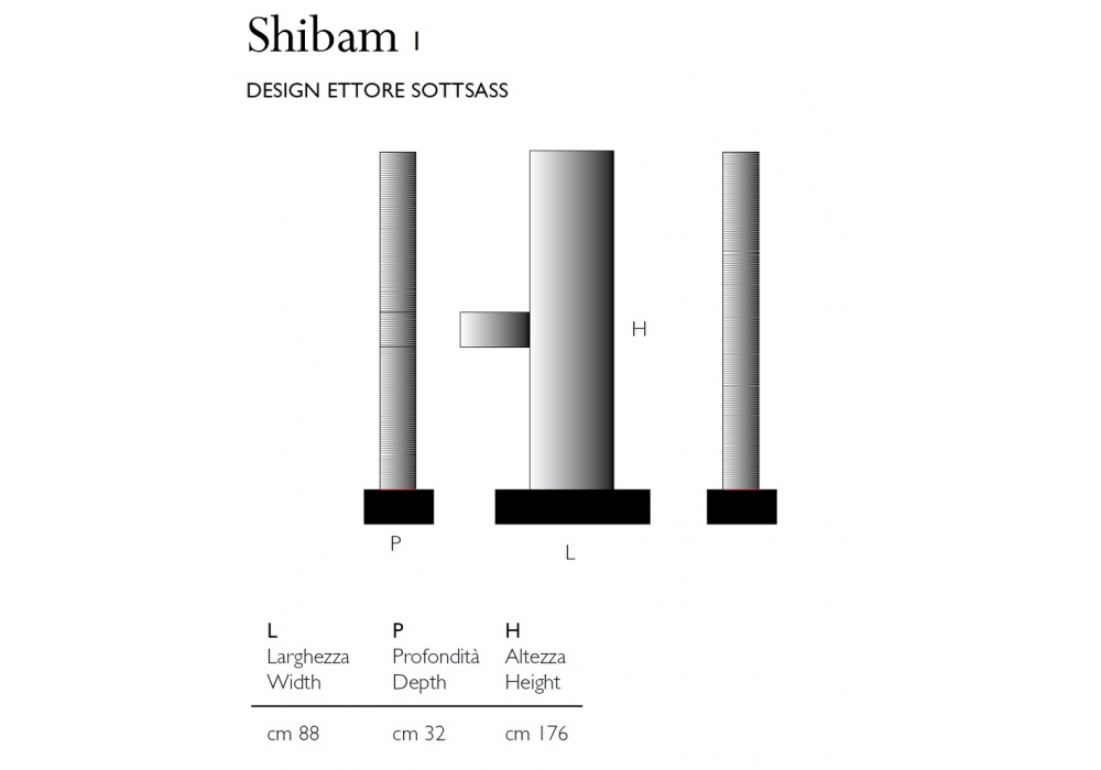 Shibam 1 conçu par Ettore Sottsass pour Glas Italia est un miroir totem avec étagère pour objets. les deux faces sont en miroir blanc tandis que les faces sont en miroir ornées de fines gravures colorées (disponibles en rose et bleu). La base est en granit noir absolu poli mat.
