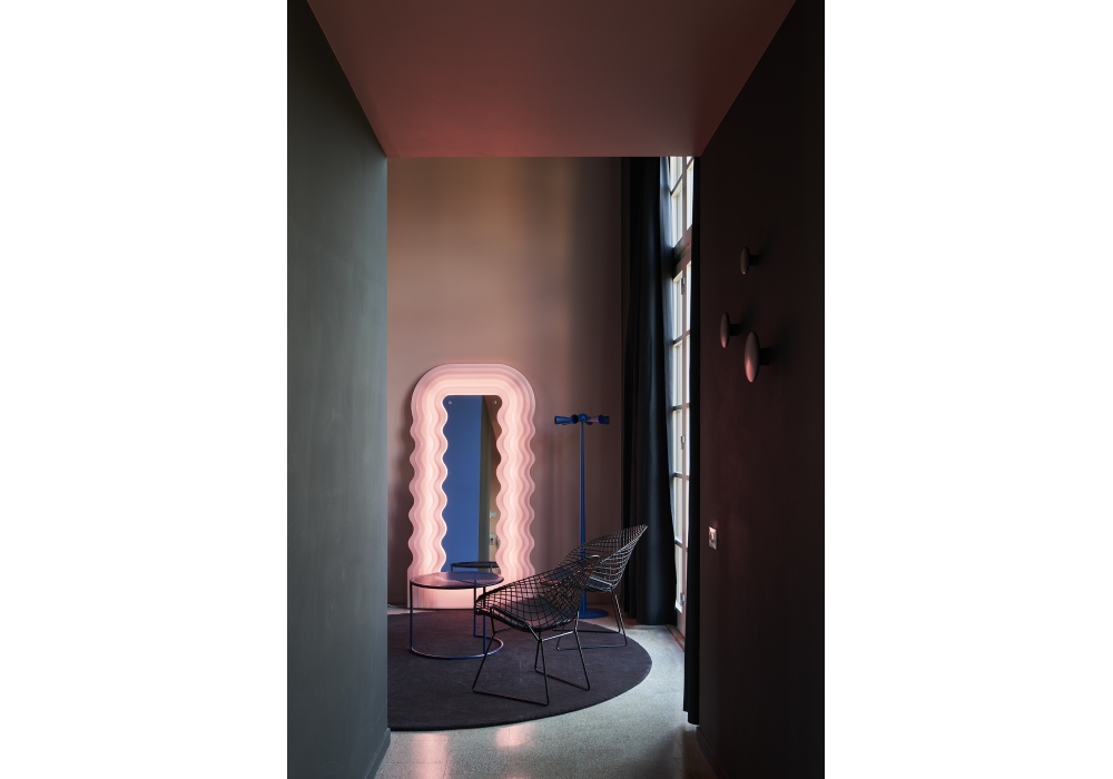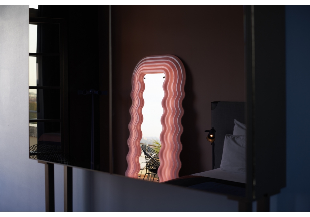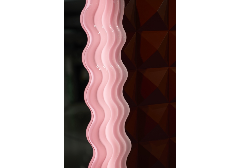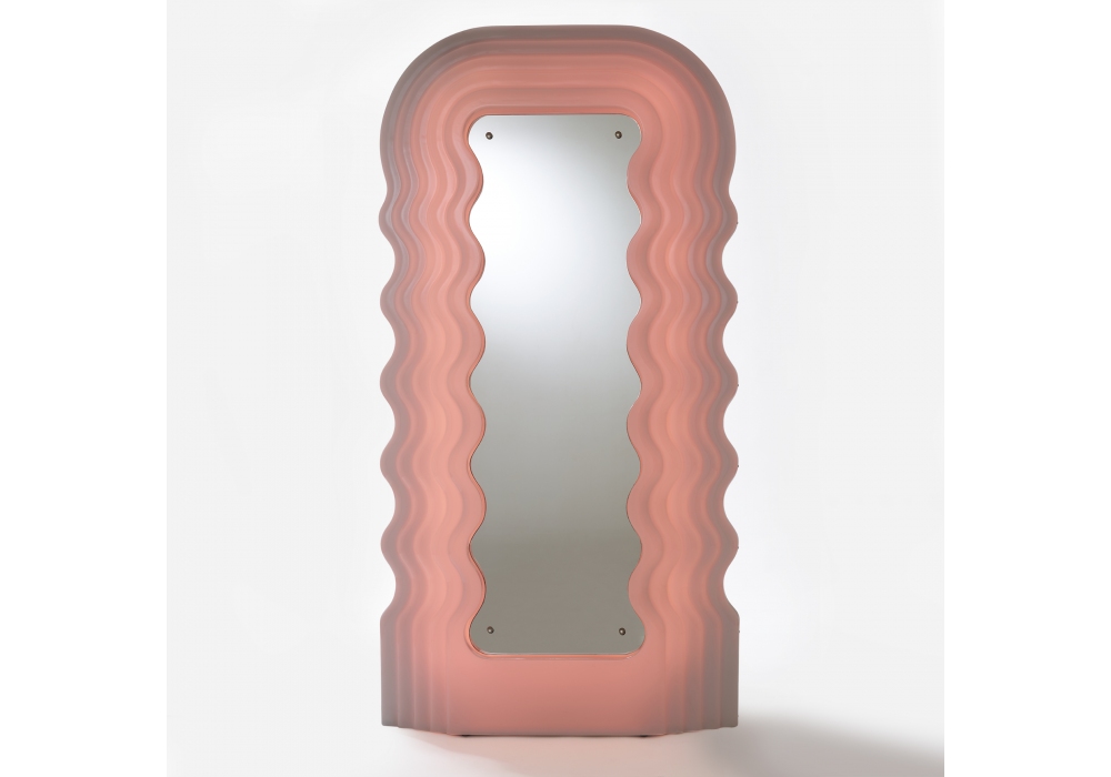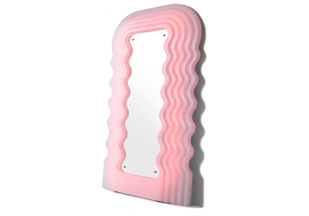 Ultrafragola conçu par Ettore Sottsass jr pour Poltronova est un miroir / lampe réalisé avec un cadre thermoformé en matière plastique opale et LED/Neon rose.