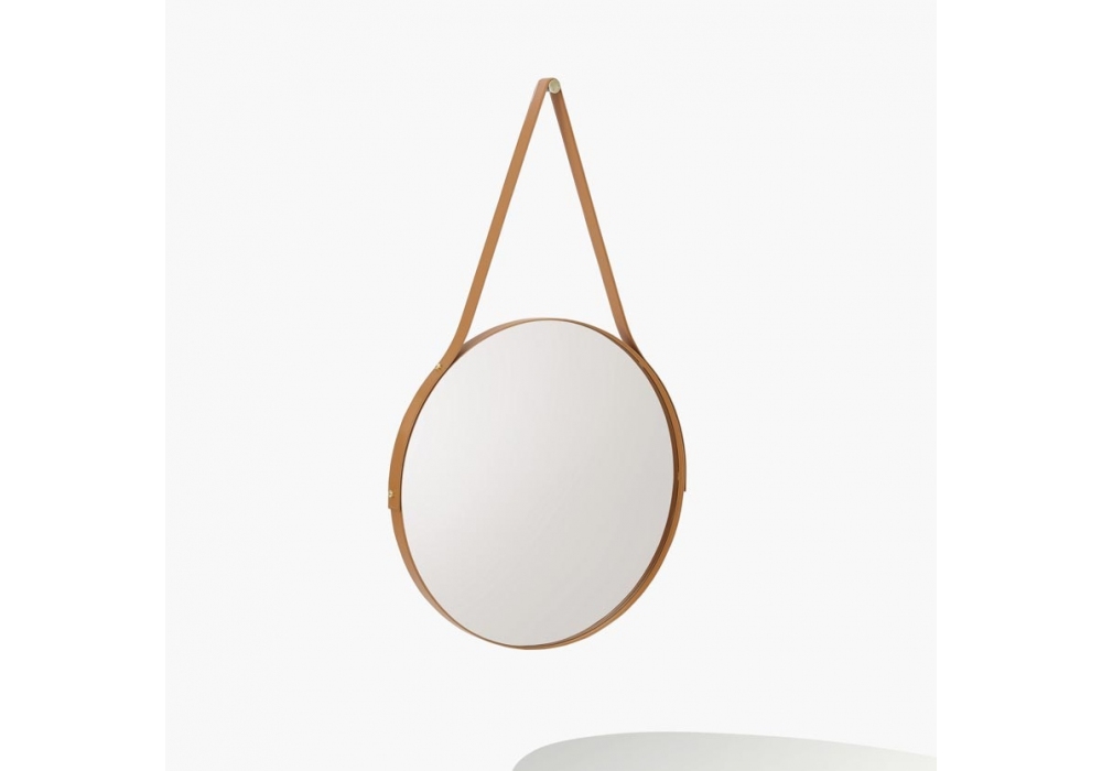Drop conçu par R&D Poliform est un miroir circulaire avec structure en métal revêtu en cuir et miroir bronzé.