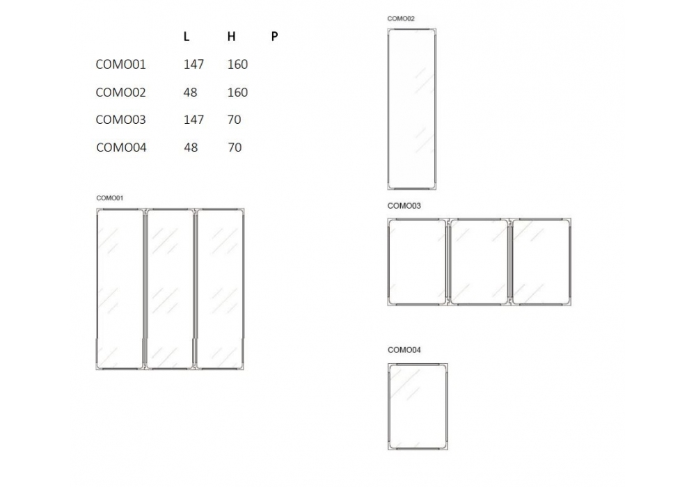 | Dimensions | 48 x H 160 cm; 48 x H 70 cm; 147 x H 160 cm; 147 x H 70 cm. |