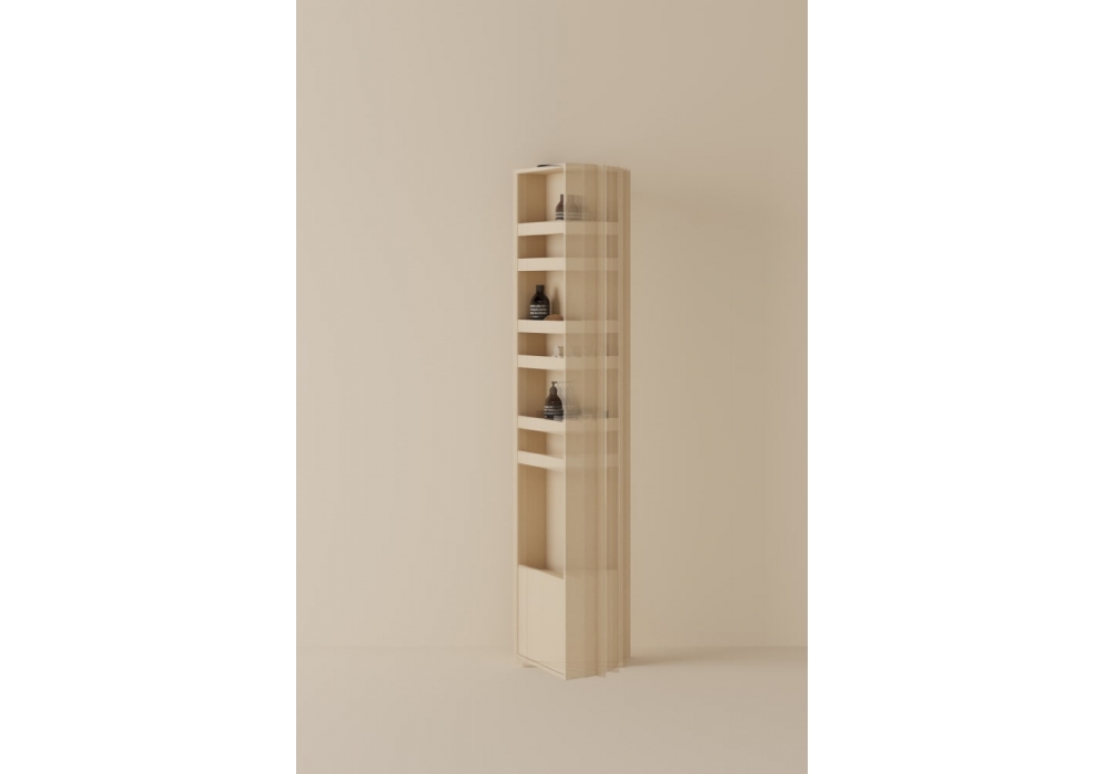 Voilà, conçu par Alessandro Andreucci pour Agape, est un meuble miroir pivotant à droite ou à gauche, réalisé en MDF avec revêtement en chêne dans différentes finitions. Un côté est entièrement en miroir et l'autre est équipé de rangements, d'étagères, de porte-serviettes. Il est également possible d'ajouter un bar électrifié ou une bande d'éclairage LED verticale.