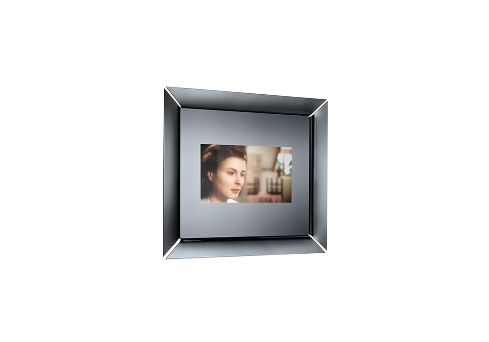 Caadre TV conçu par Philippe Starck pour Fiam est un miroir avec cadre TV intégré en verre semi-réfléchissant couleur titane, composé de 4 éléments simples incurvés en verre semi-réfléchissant en finition titane rétro-peint noir ou en rétro-réfléchissant verre en bronze argenté. Structure en métal peint noir mat.