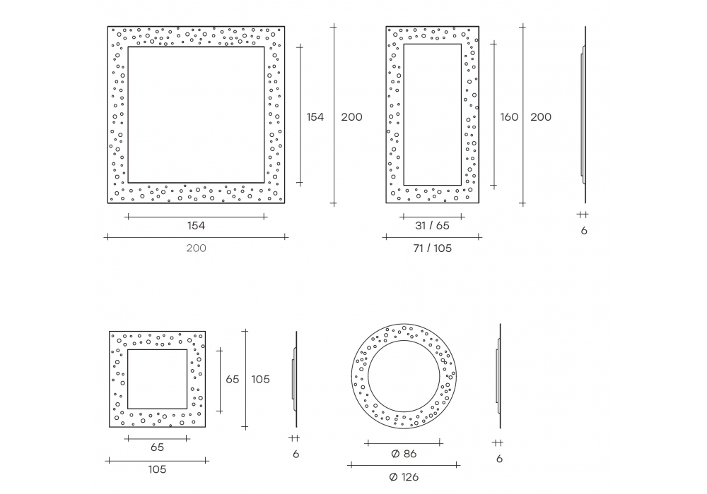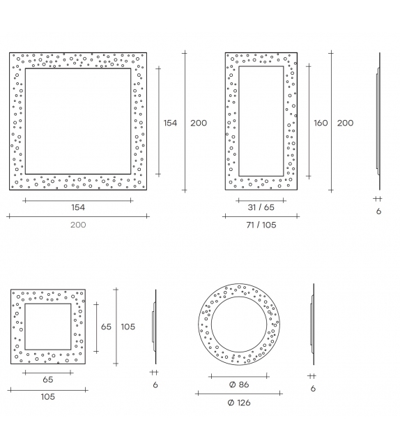 | Dimensions | 200 x 6 x H 105 cm; 200 x 6 x H 71 cm; 105 x 6 x H 105 cm; Ø 126 cm x 6 cm. |