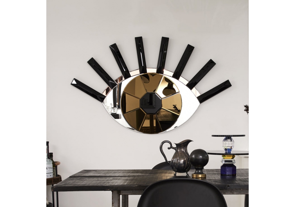 Eye Of The Tiger produit et conçu par Reflections Copenhagen est un miroir abstrait en verre appliqué sur une base de support en MDF peint en noir. La particularité de ce miroir est sa forme qui met en scène un œil composé de multiples pièces en verre de différentes couleurs et tailles découpées et assemblées à la main.
