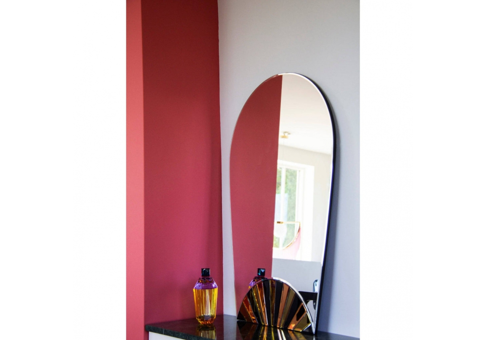 Twilight produit et conçu par Reflections Copenhagen est un miroir en verre arrondi appliqué sur une base de support en MDF peint en noir. Le miroir est enrichi d'applications en argent, noir, or militaire et bronze.