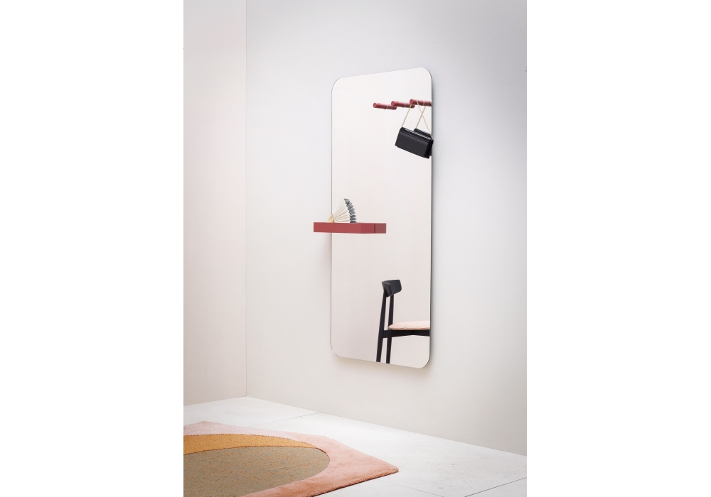 Benvenuto conçu par Paolo Cappello pour Miniforms est un miroir / portemanteau avec patères et plateau à pièces laqué, disponible en différentes finitions.
