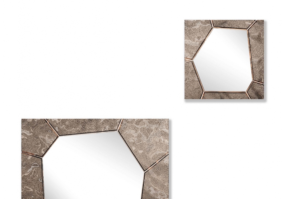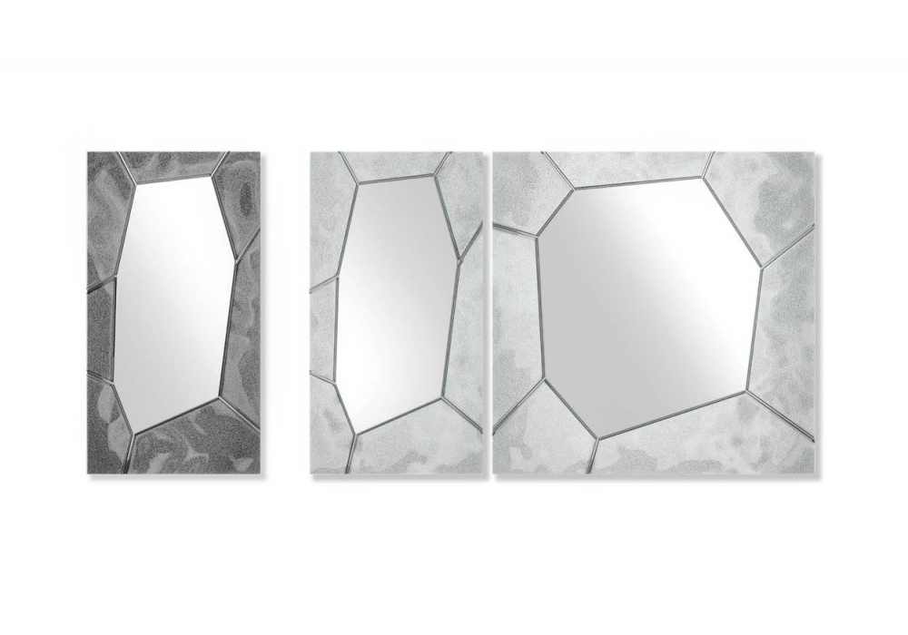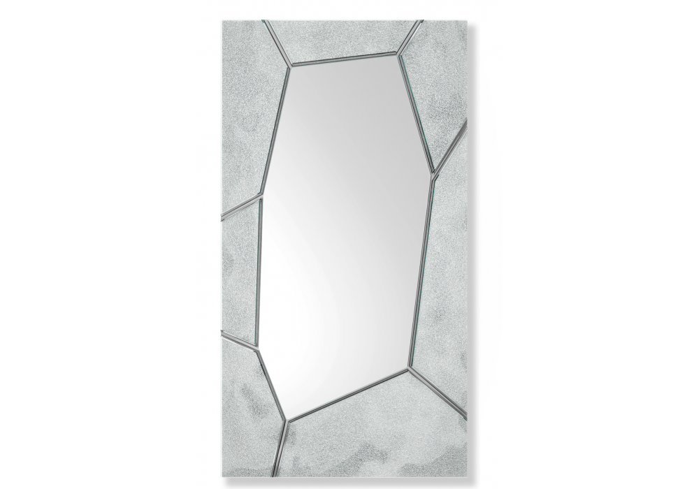 Silica conçu par Arik Levy pour Fiam est un miroir mural ou de sol avec cadre en verre fusionné argenté, avec une texture obtenue à partir d'une décoration artisanale. Châssis arrière en métal peint. Possibilité d'accrocher verticalement ou horizontalement.