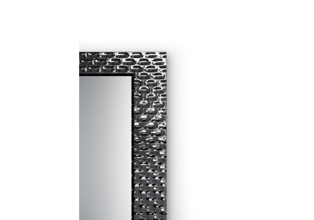 Pasha conçu par Dainelli Studio pour Fiam est un miroir caractérisé par un cadre en verre fondu à haute température, argenté au dos avec décoration en relief. Cadre arrière en métal peint.