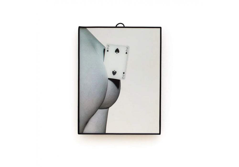 Two of Spades conçu par Toiletpaper Magazinepour Seletti est un miroir décoré d'un cadre en plastique noir.