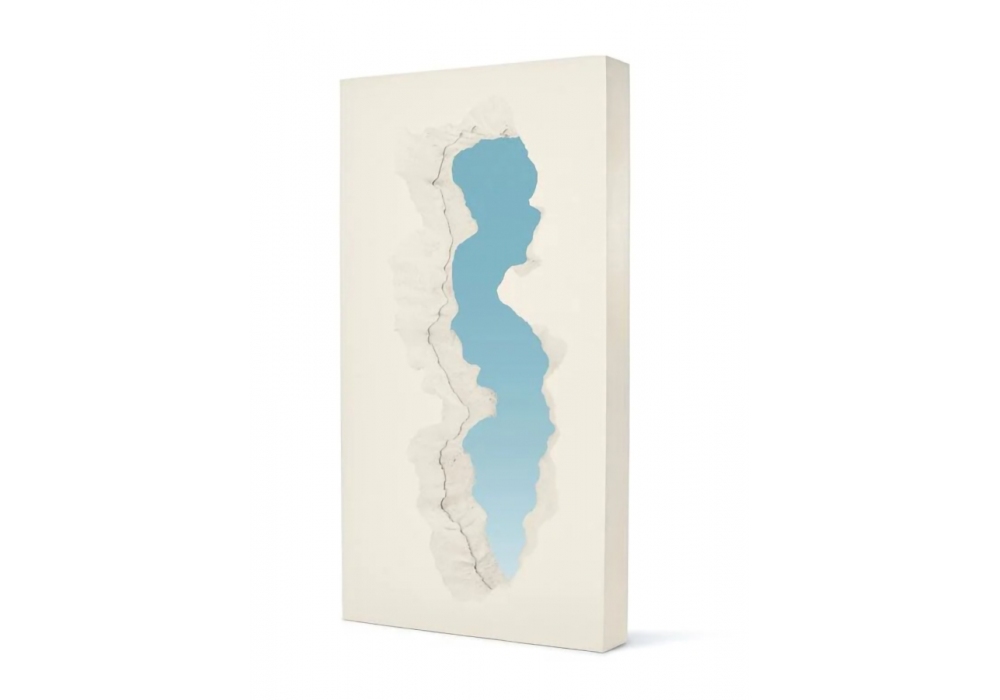 Broken Mirror Almost White conçu par Snarkitecture pour Gufram est un miroir entouré d'un cadre en polyuréthane blanc souple qui prend la forme d'une brèche dans le mur, une fissure qui reflète l'espace qui l'entoure, mais crée en même temps un effet optique aliénant comme si la pièce s'ouvrait sur le monde extérieur ou sur un autre environnement.