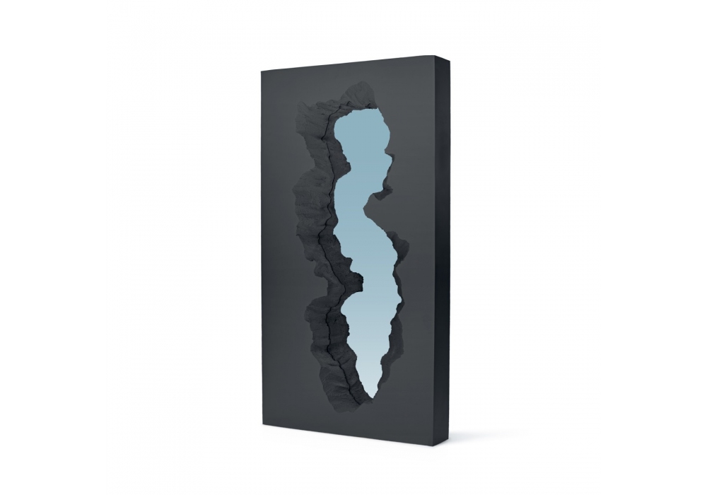 Broken Mirror Almost Black conçu par Snarkitecture pour Gufram est un miroir entouré d'un cadre en polyuréthane blanc souple qui prend la forme d'une brèche dans le mur, une fissure qui reflète l'espace qui l'entoure, mais crée en même temps un effet optique aliénant comme si la pièce s'ouvrait sur le monde extérieur ou sur un autre environnement.