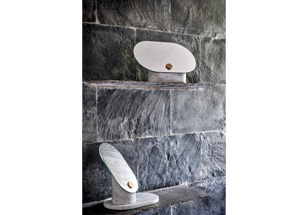 Costellation conçu par Studiopepe pour Agape, est un miroir de salle de bains en marbre blanc de Carrare ou noir de Marquina. Détails en laiton naturel brossé. Disponible en version horizontale ou verticale, avec ou sans plateau.