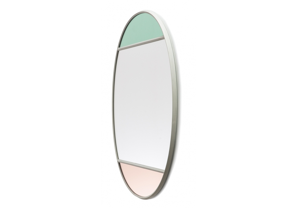 Vitrail conçu par Inga Sempé pour Magis est un miroir ovale avec un cadre en caoutchouc. Miroir avec verre filmé au dos et bandes colorées.