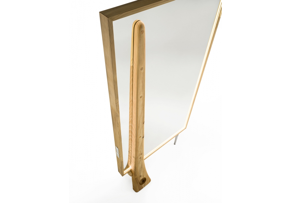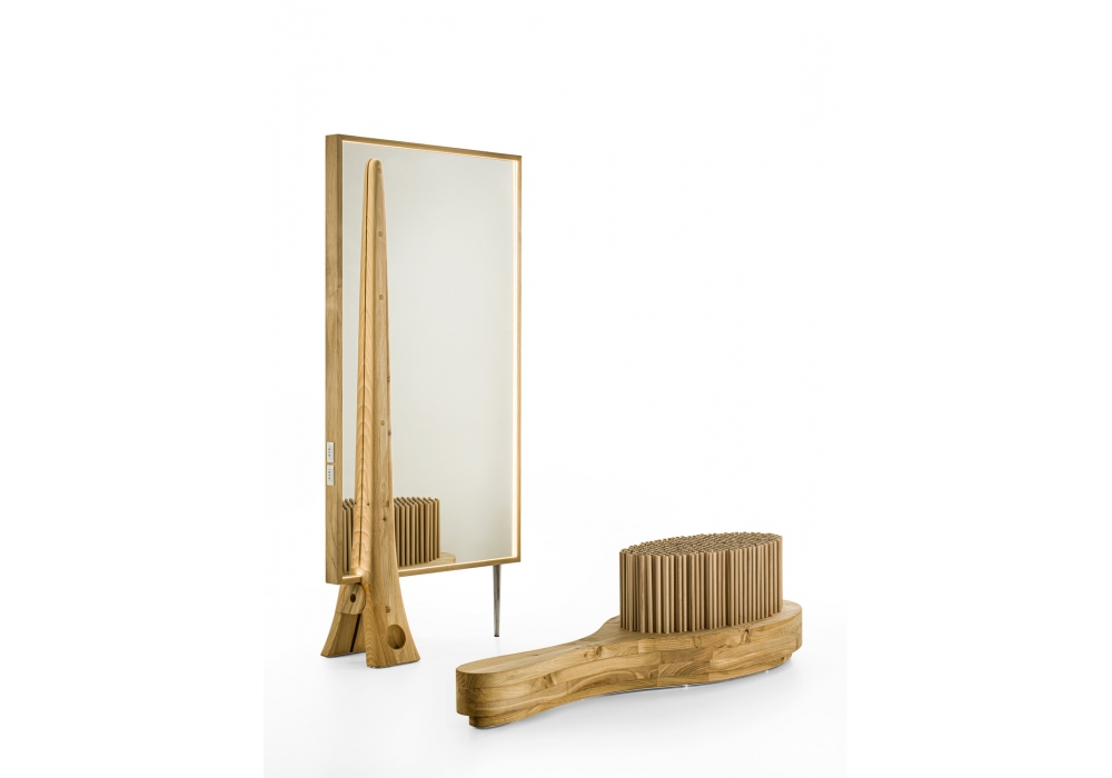 Bekkuccio conçu par A.C. Design pour Riva 1920 est un miroir en bois de cèdre massif parfumé qui rappelle l'objet le plus emblématique de la coiffure : la pince à cheveux.
