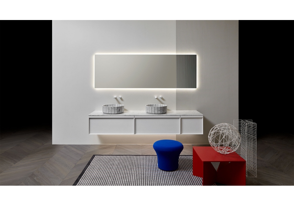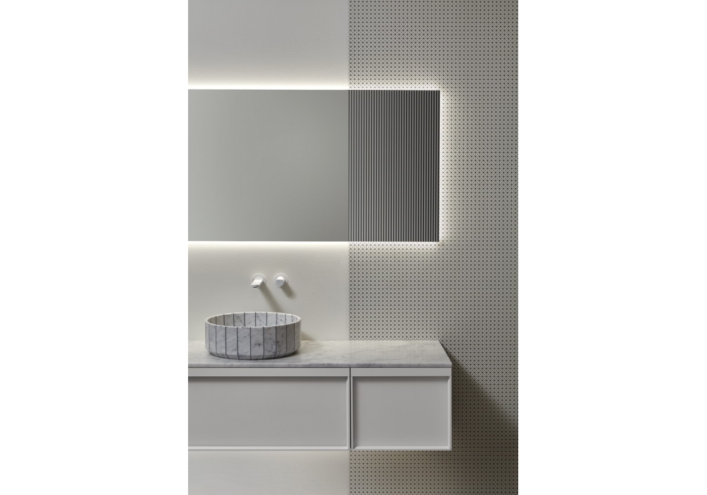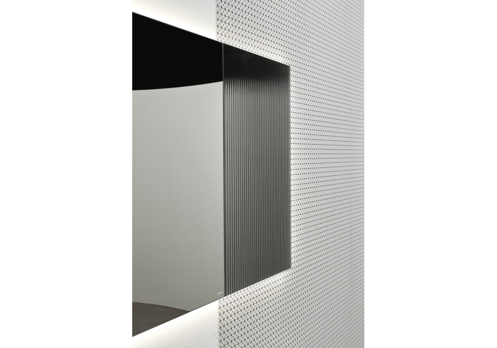Distinto conçu par Gumdesign pour Antonio Lupi est un miroir aux bords polis avec un insert en verre strié, un éclairage LED blanc et un cadre. Disponible en plusieurs dimensions.