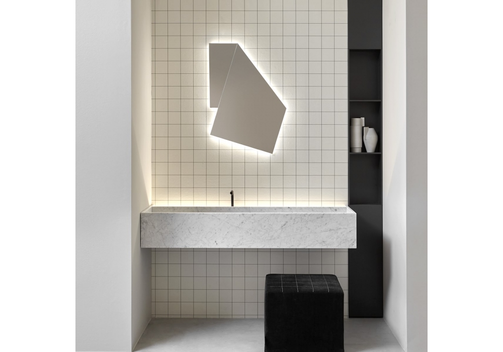 Specchidicarta conçu par Gumdesign pour Antonio Lupi est un miroir aux bords polis, doté d'un éclairage LED blanc et d'un cadre noir. Il est également disponible avec un insert laqué noir.