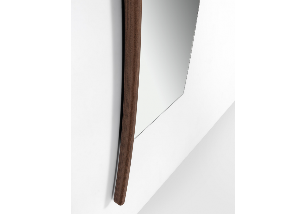 Katana conçu par Giuseppe Viganò pour Porada est un miroir mural avec un élément décoratif incurvé sur le côté, en noyer canaletta massif.