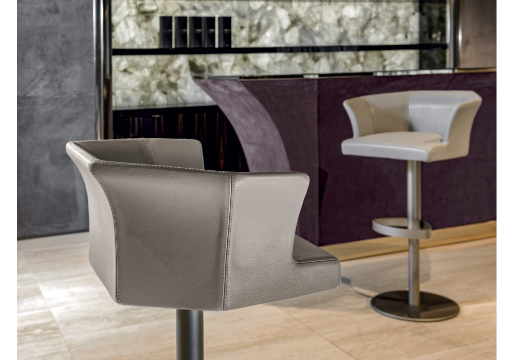 Delon conçu par Kazemekas pour Longhi est un tabouret avec structure en fer, mousse moulée à froid et recouvert de cuir non amovible. La base en métal pivote à 360° et est réglable en hauteur au moyen d'une colonne télescopique à gaz "Stabilus".