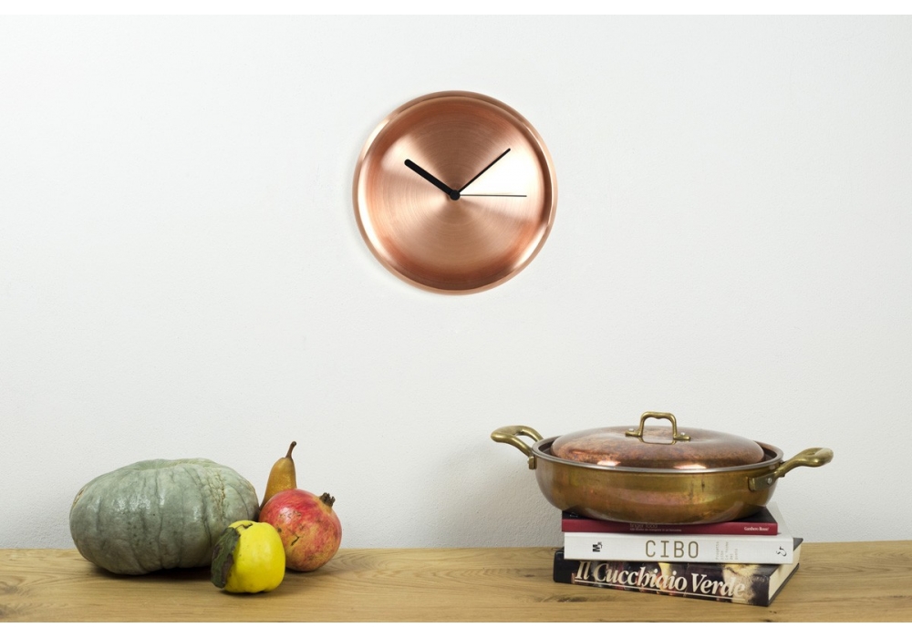 Turi conçue par Dario Gaudio pour InternoItaliano est une horloge murale en cuivre tourné à la main inspiré de vaisselle et pots qui ornaient les murs de les vieux cuisines. Les lignes de Turi sont douces et s'adaptent à tout les styles.