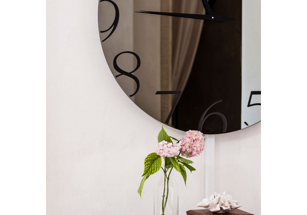 Moment conçu par Brogliato & Traverso pour Cattelan Italia est un miroir/horloge mural en verre miroité ou miroité fumé avec lancettes en aluminium noir. Disponible en version carrée ou ronde.