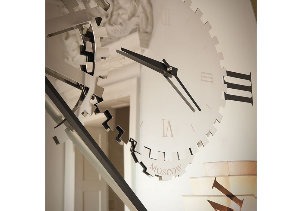 Times conçu par Andrea Lucatello pour Cattelan Italia est un miroir/horloge en cristal sérigraphié miroité ou miroité fumé. Détails en acier.