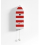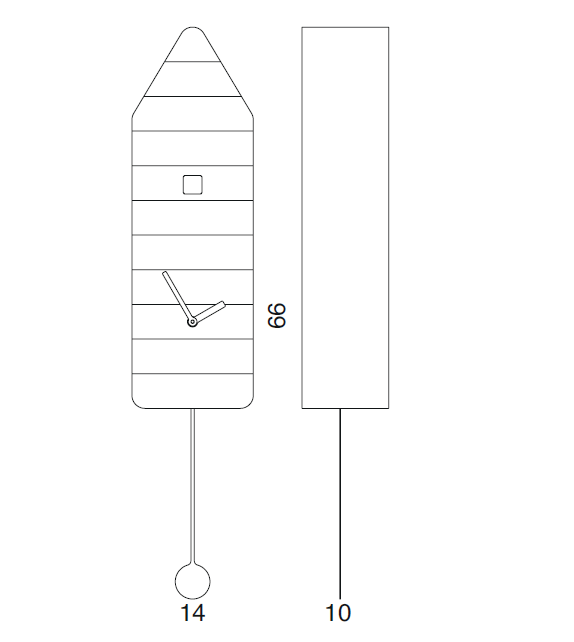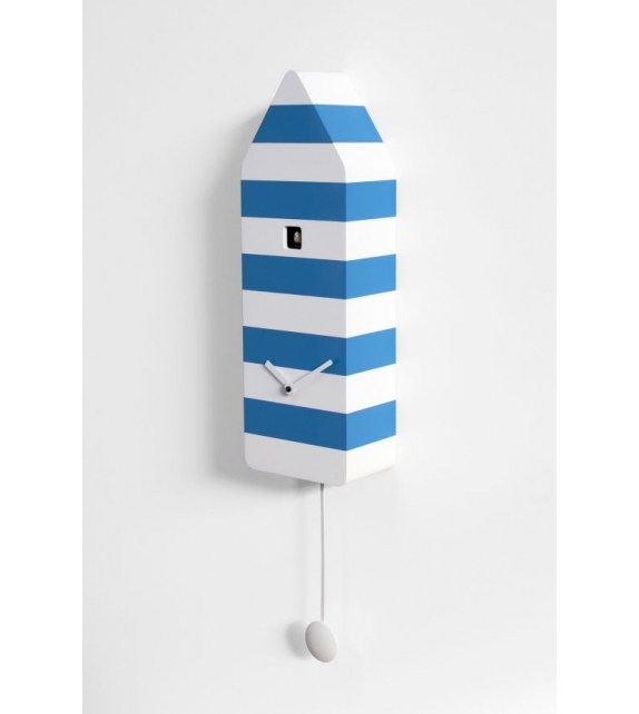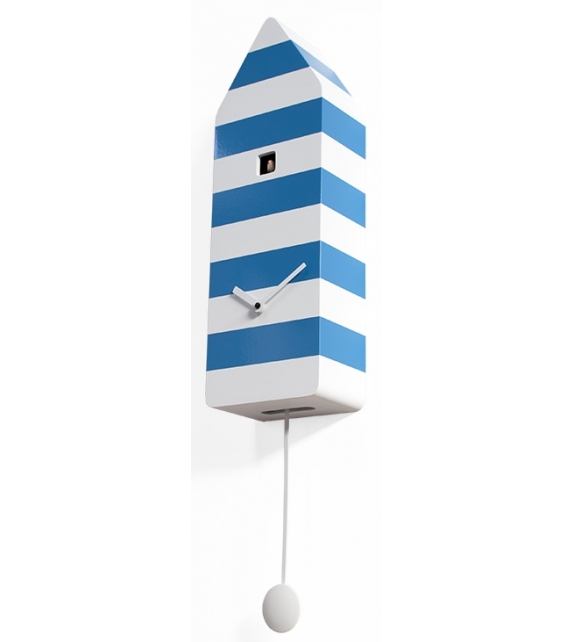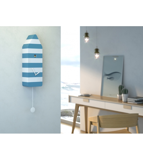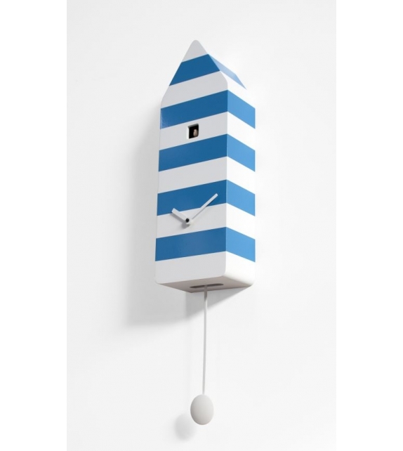 Capri conçue par Alberto Sala pour Progetti est une horloge coucou en bois verni. Elle est équipée d'un mouvement à quartz alimenté par pile avec un capteur qui exclut automatiquement la sonnerie en l'absence de lumière.