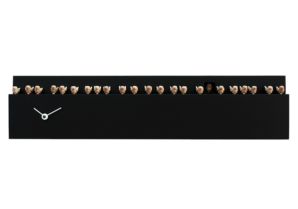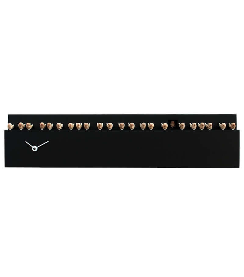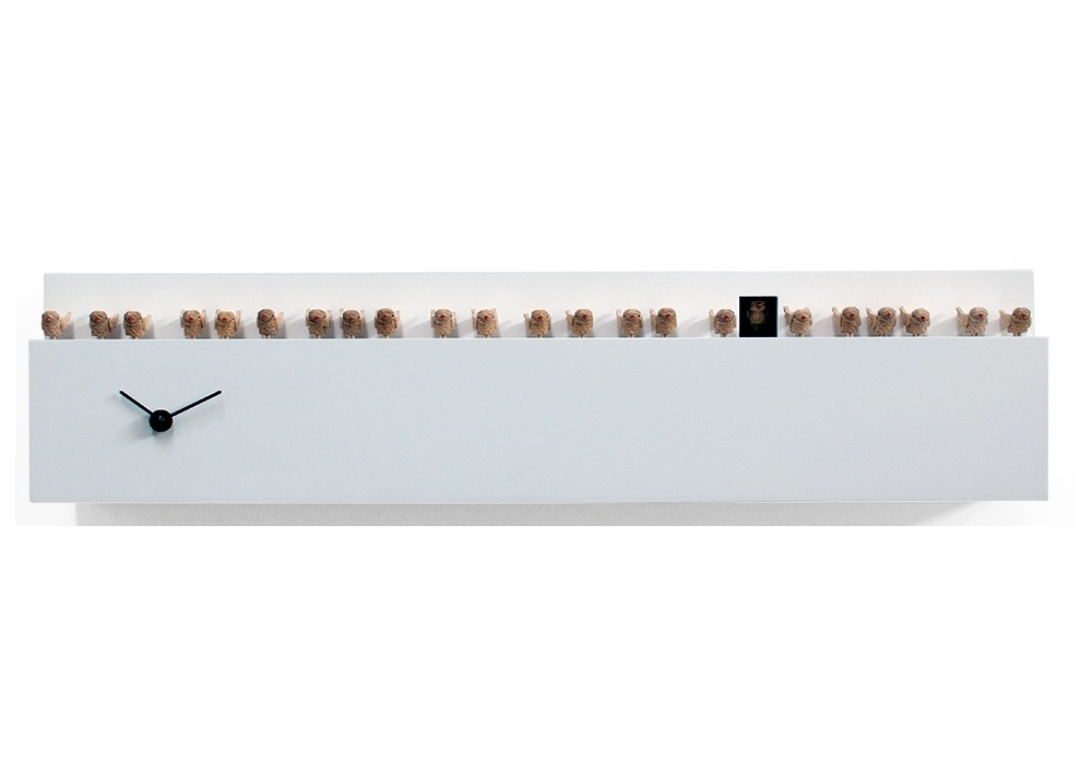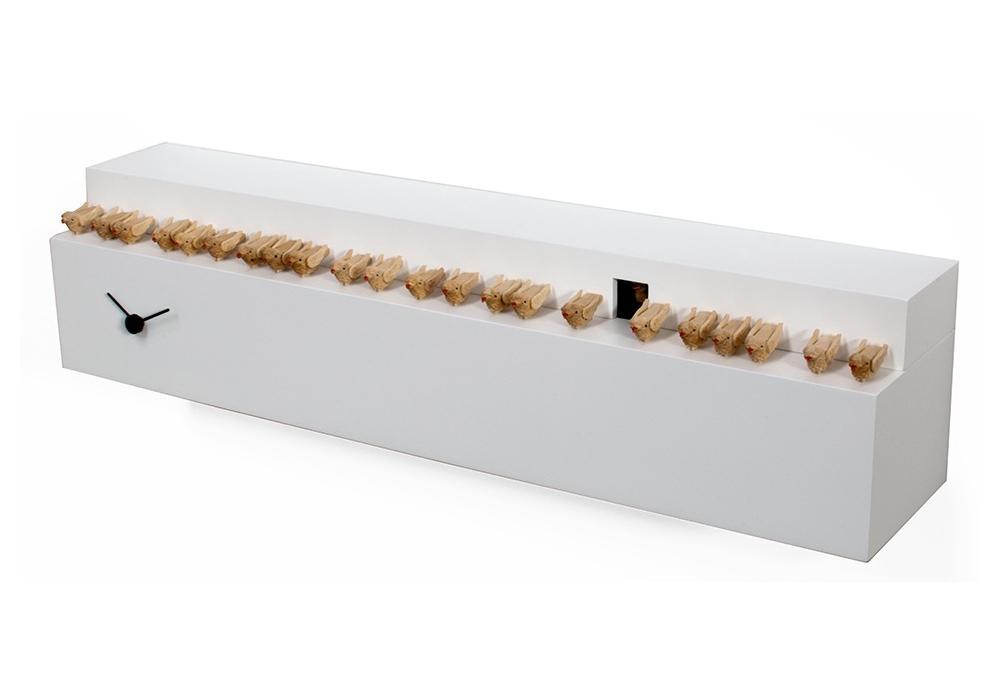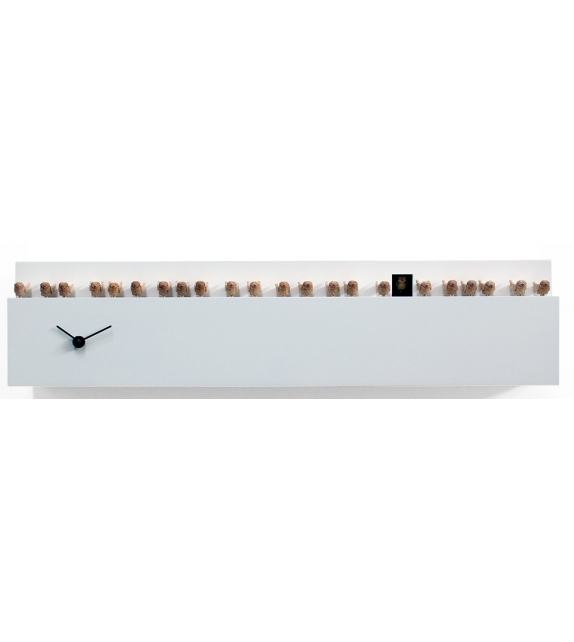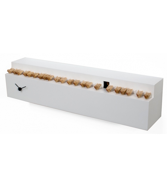 Fatti + in Là conçue par Studio Kuadra pour Progetti est une horloge coucou réalisée en bois verni. Les oiseaux sont entièrement faits à la main. Le vingt-troisième chante une fois par heure en se penchant en avant et en s'inclinant. Le mouvement coucou à piles est doté d'un capteur photosensible qui l'empêche de chanter lorsqu'il fait sombre. De plus, un panneau à boutons-poussoirs vous permet de régler l'intensité du son ou de l'éteindre complètement. Il est possible d'accrocher l'horloge au mur, ou de la poser sur une surface plane.