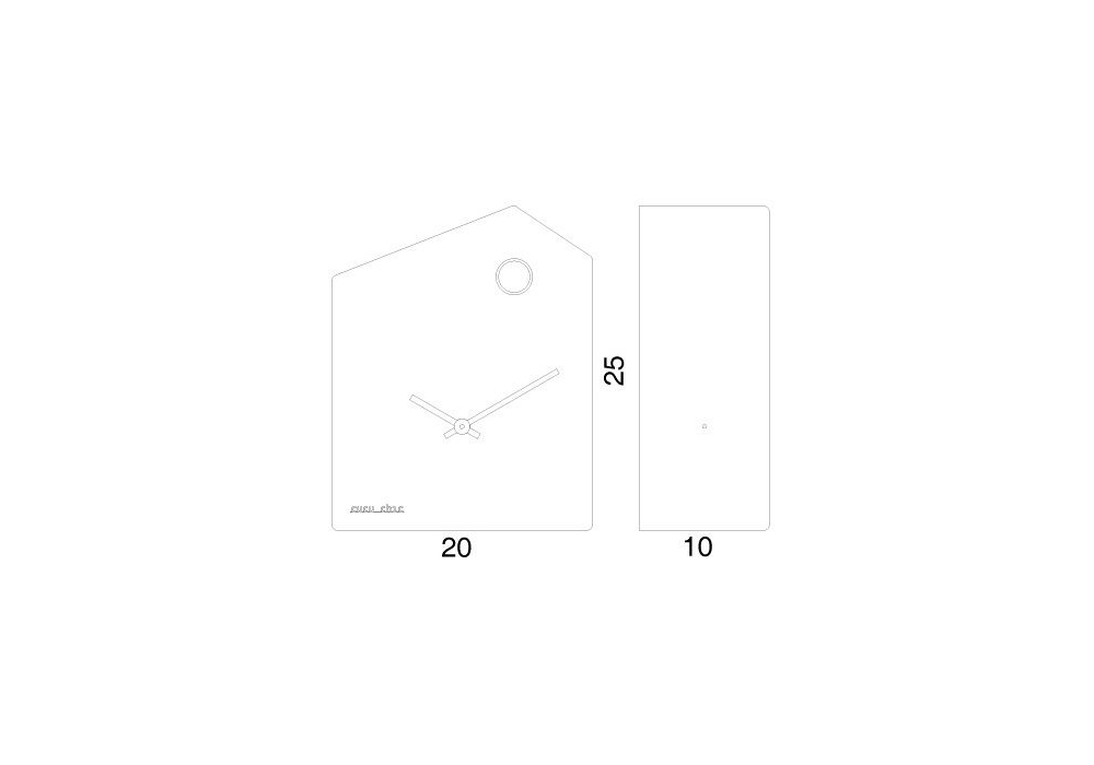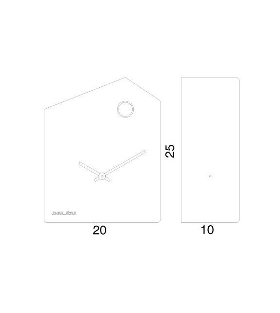 Cucuchic conçue par Riccardo Paolino et Matteo Fusi pour Progetti est une horloge à coucou en bois avec une finition brillante vernie avec des peintures non toxiques entièrement polies à la main et des détails chromés. Le mouvement à piles est équipé d'un capteur photosensible qui s'arrête automatiquement de chanter en l'absence de lumière. Un bouton poussoir permet de régler l'intensité du son ou de l'éteindre complètement. Mouvement à quartz à piles.