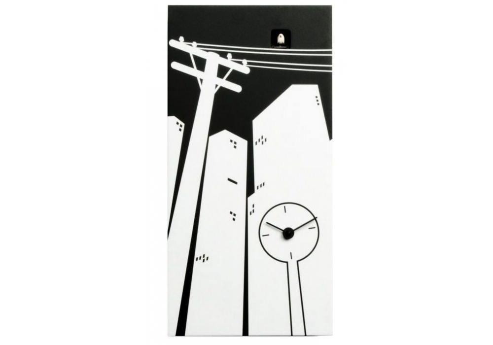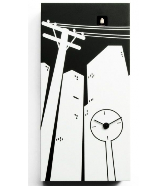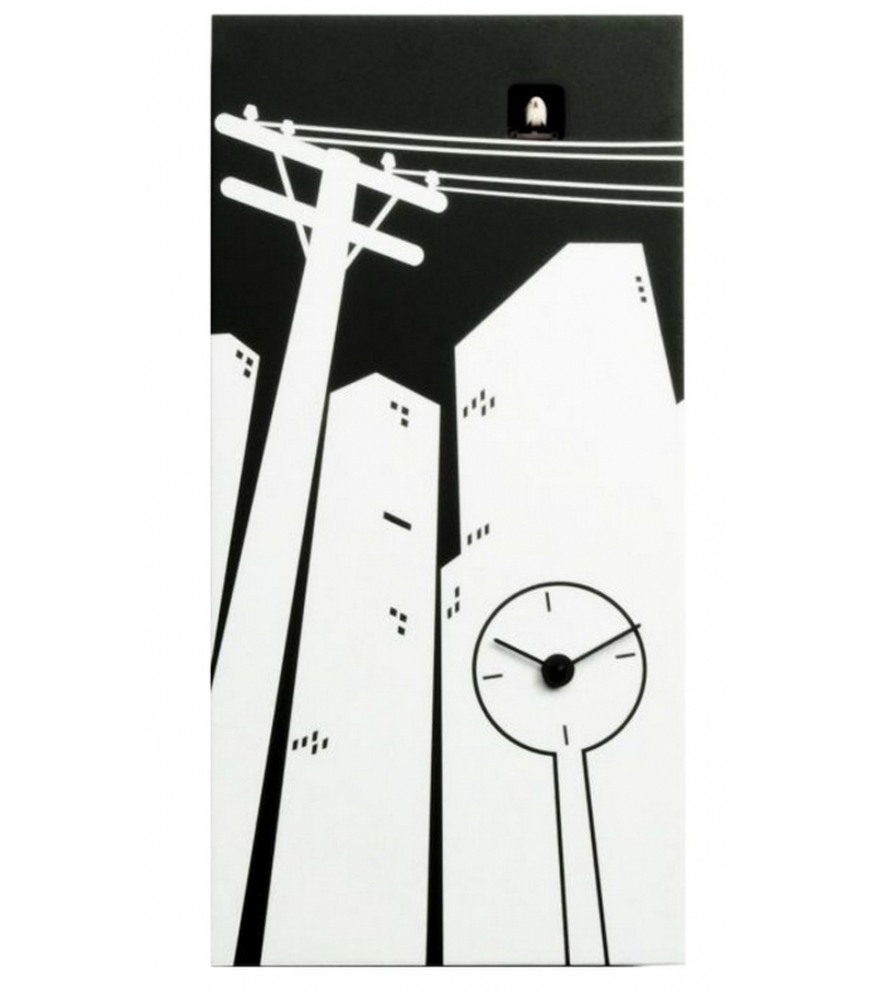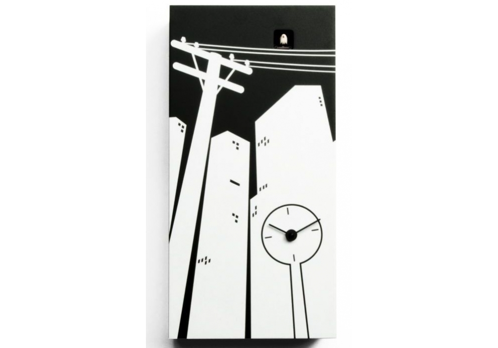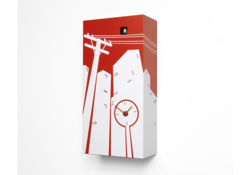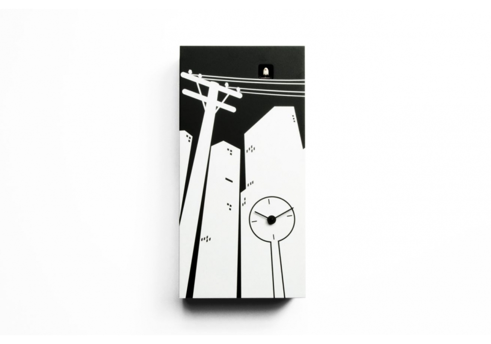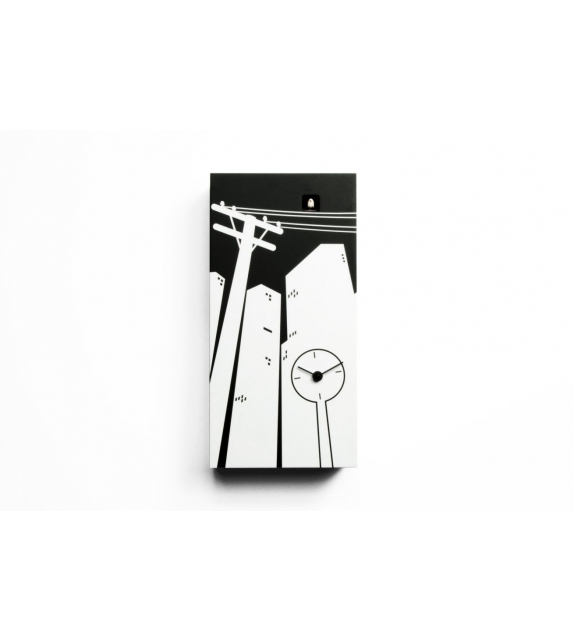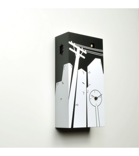 Cucucity conçue par Riccardo Paolino & Matteo Fusi pour Progetti est une horloge à coucou en bois de différentes finitions. Mouvement à quartz à piles. Un capteur sensible à la lumière arrête automatiquement la sonnerie en l'absence de lumière.